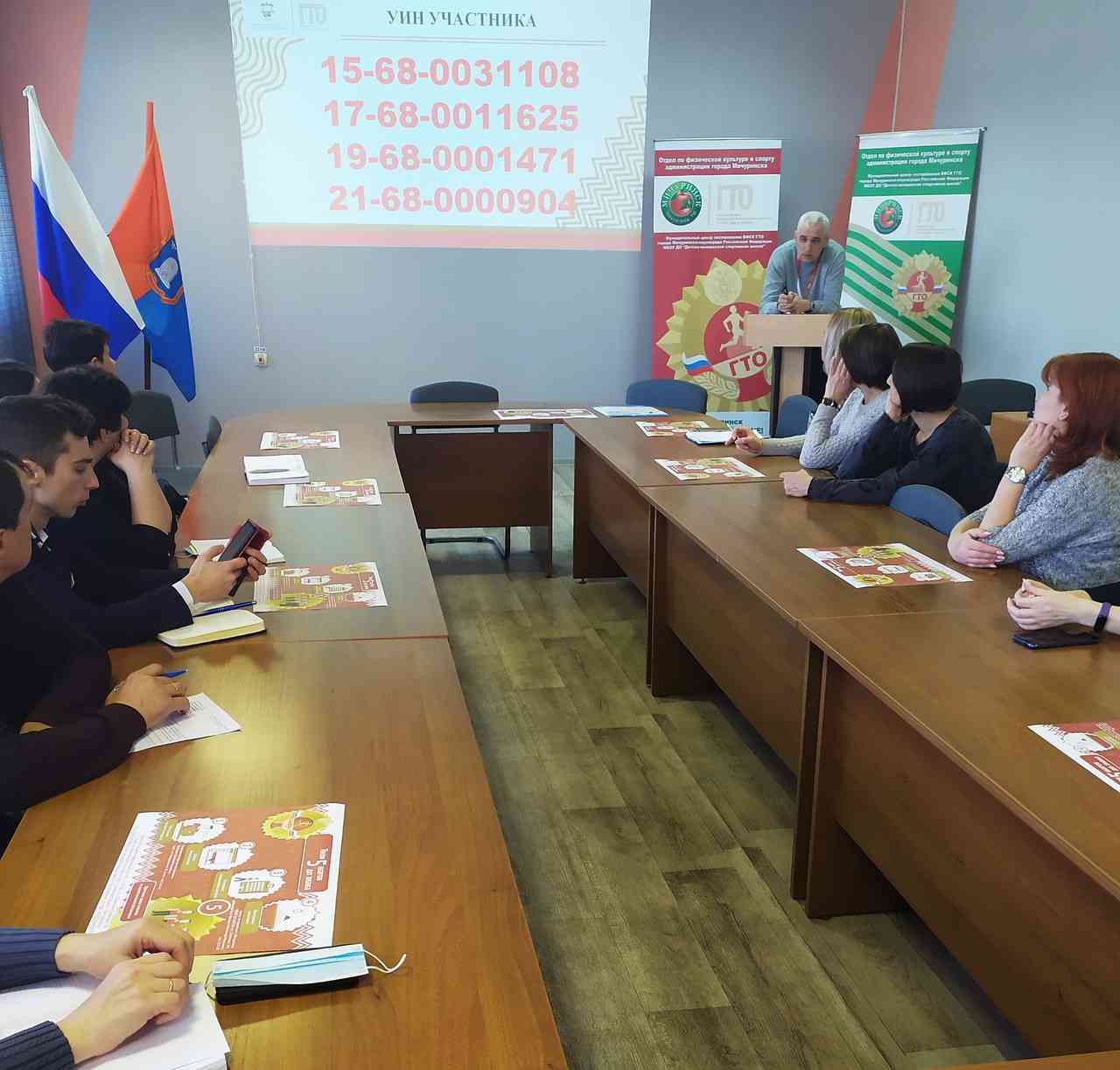 26 марта 2021 года в рамках проведения «Дней ГТО», приуроченных к 90-летию с момента создания Всероссийского физкультурного комплекса «Готов к труду и обороне СССР» и 7-й годовщине со дня подписания Президентом Российской федерации Указа «О Всероссийском физкультурно-спортивном комплексе «Готов к труду и обороне», муниципальный центр тестирования по выполнению видов испытаний (тестов), нормативов ВФСК ГТО г. Мичуринска совместно с отделом по физической культуре и спорту администрации г. Мичуринска проводил день открытых дверей. В конференц-зал учебно-методического и информационного центра были приглашены представители предприятий города, заведений высшего образования, различных государственных ведомств и общеобразовательных организаций города.